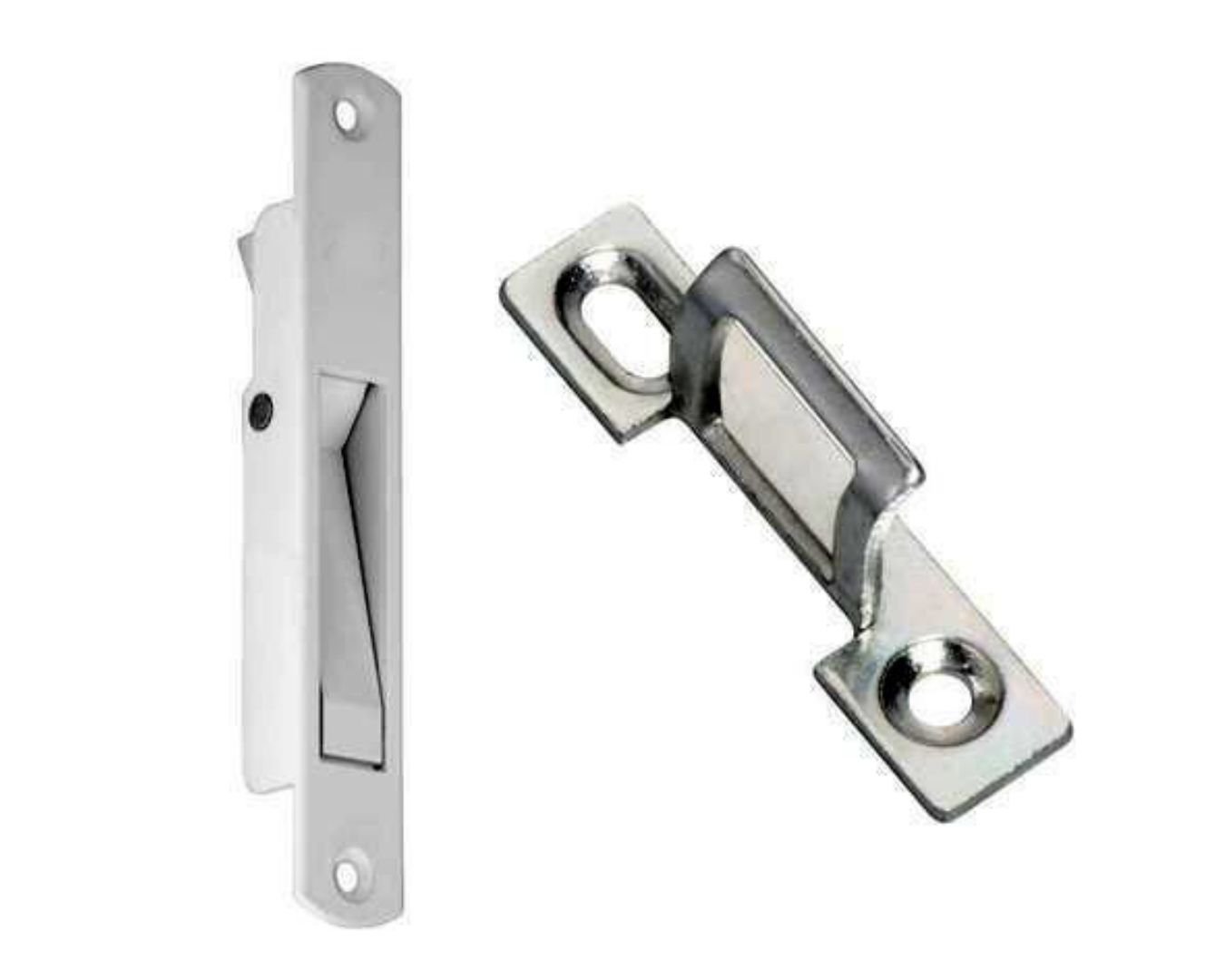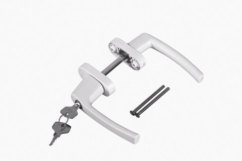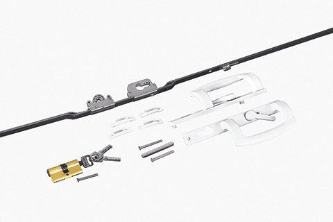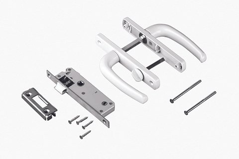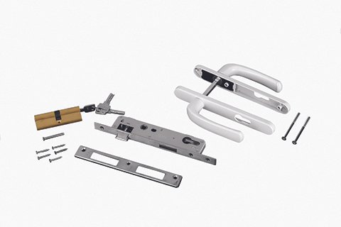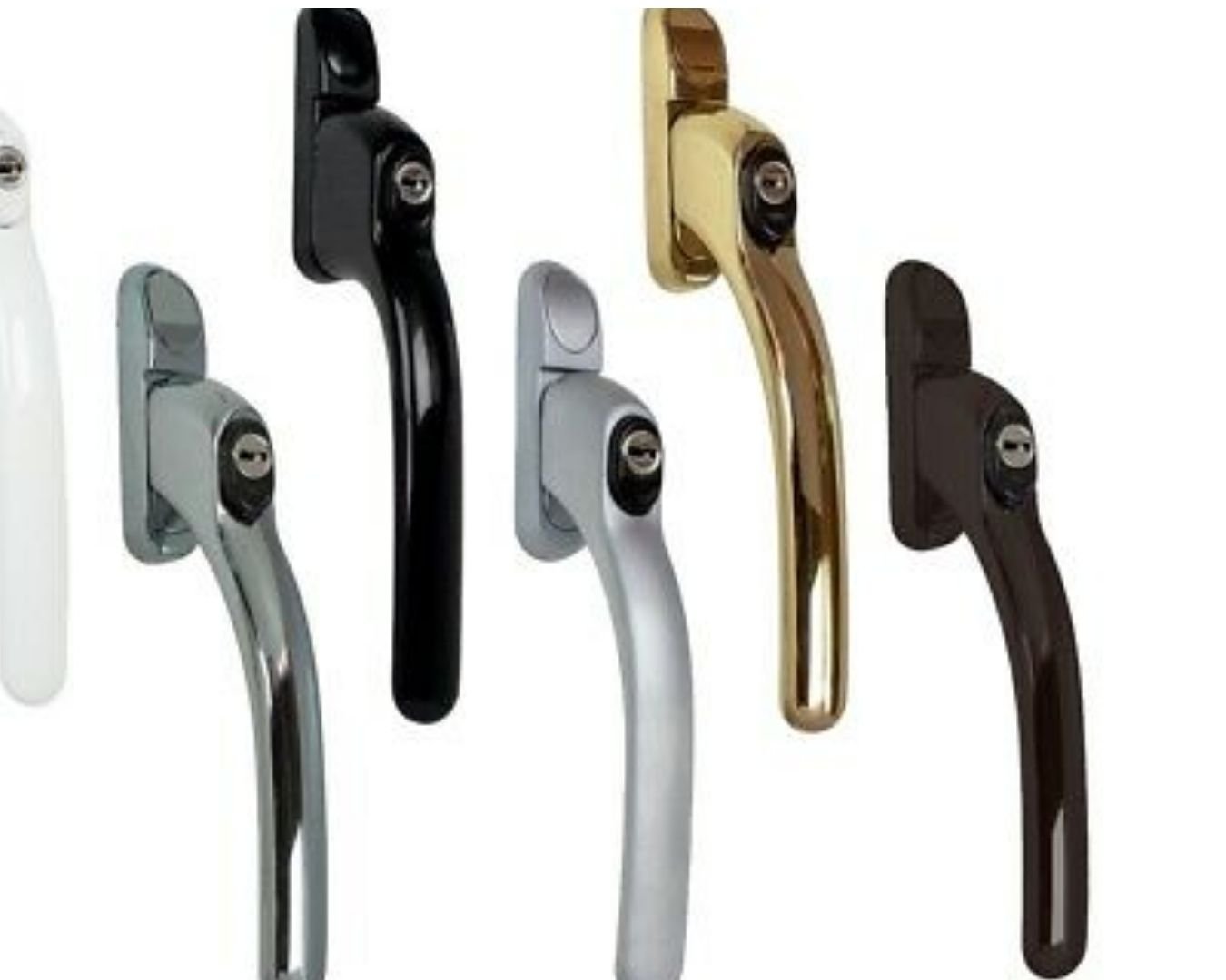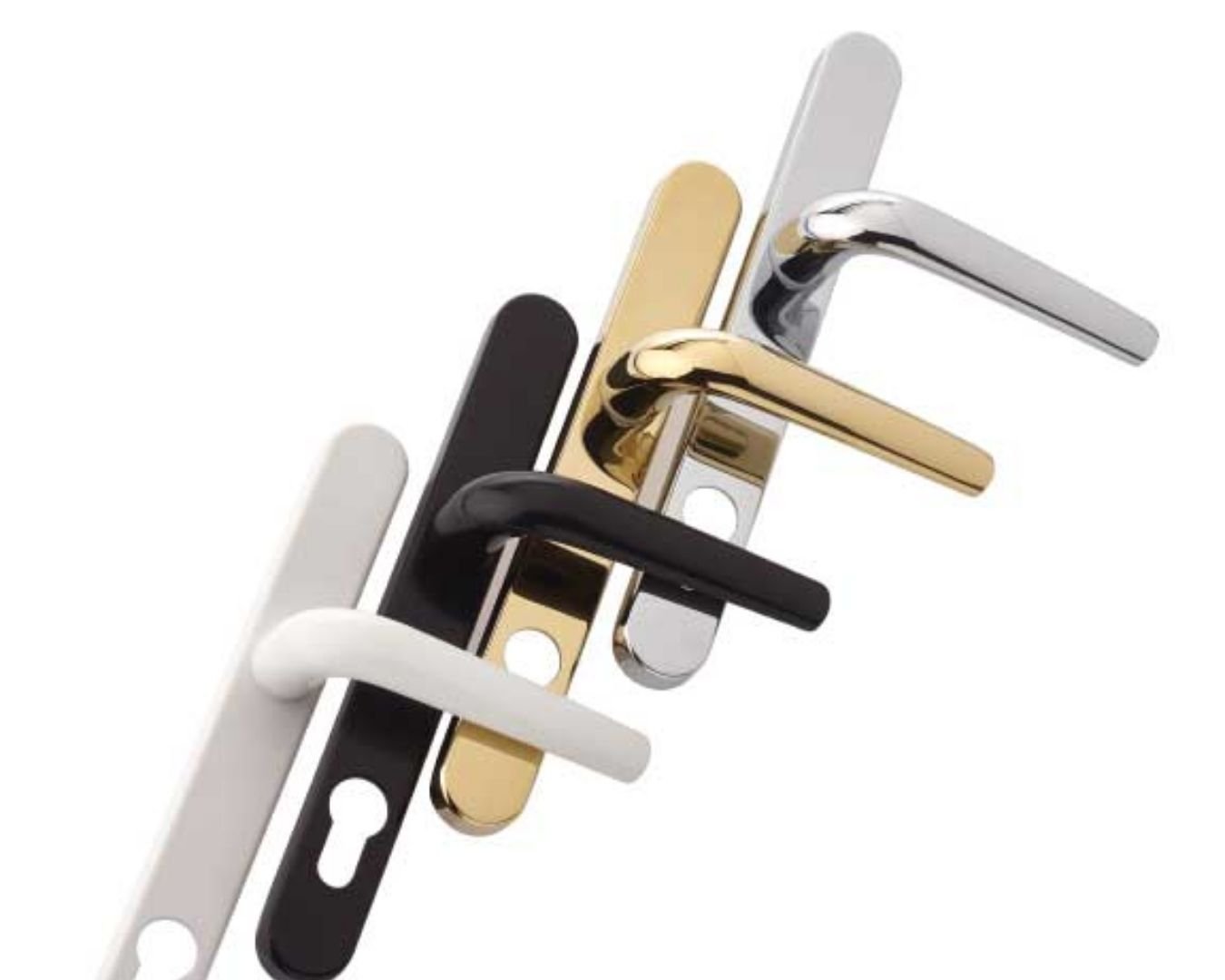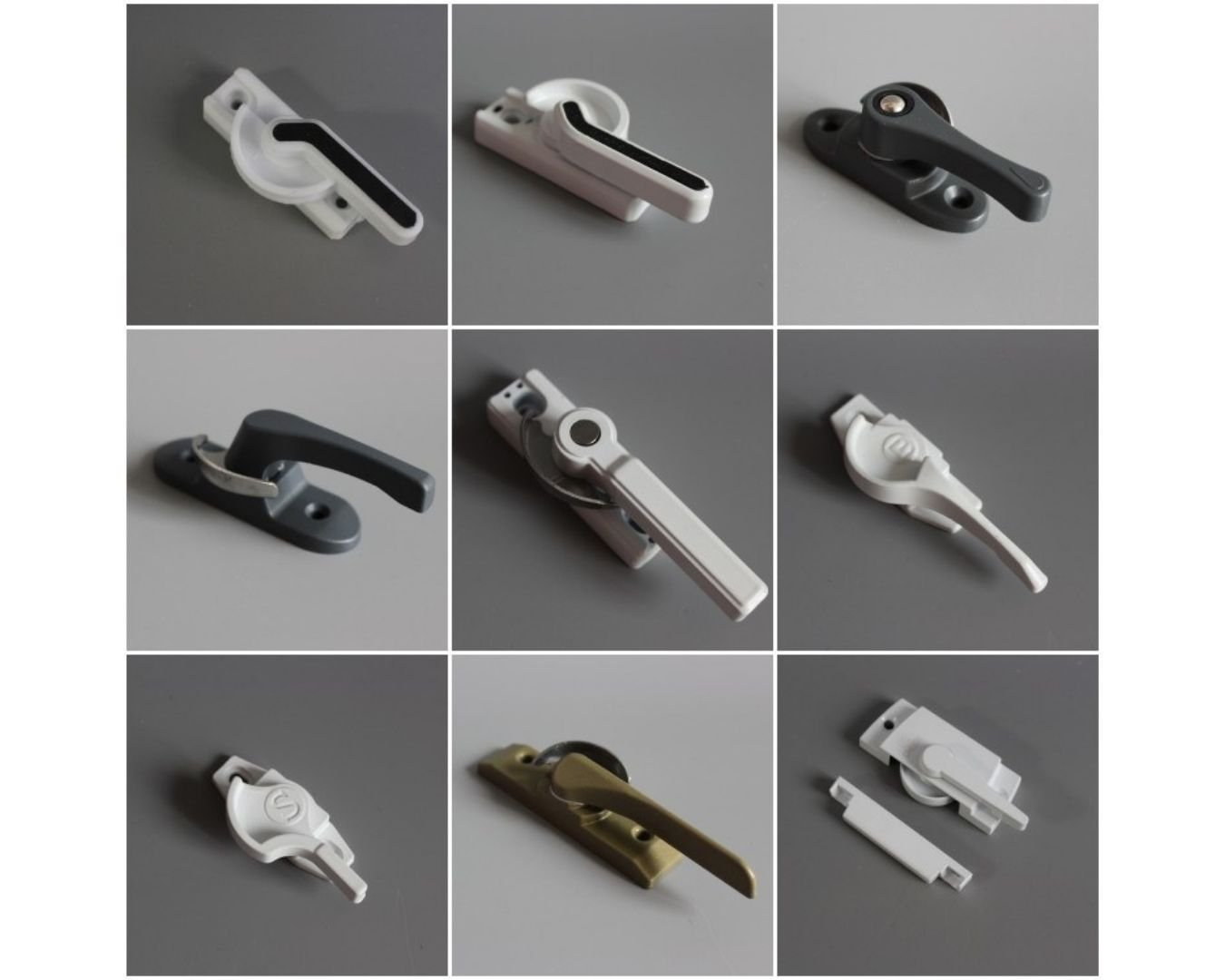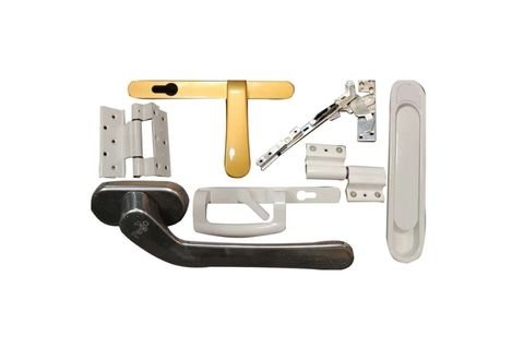 Flat-lay shot of UPVC door handles, hinges, locks, and stoppers arranged aesthetically on white background, shadows soft, modern hardware display, 4K product photography style.