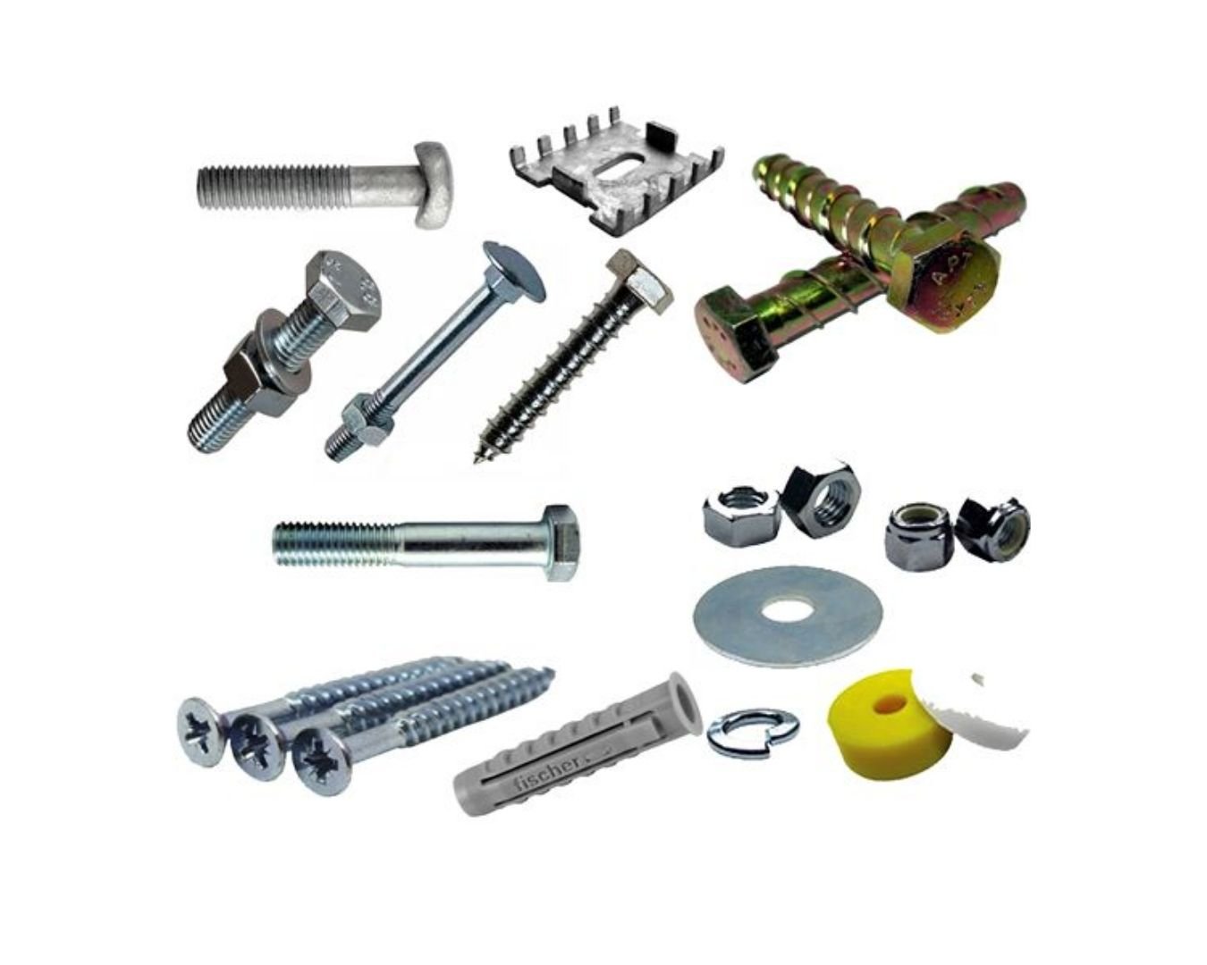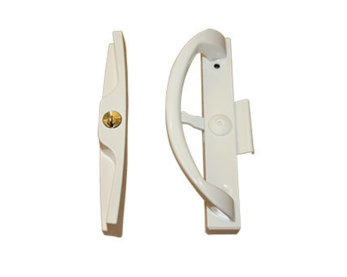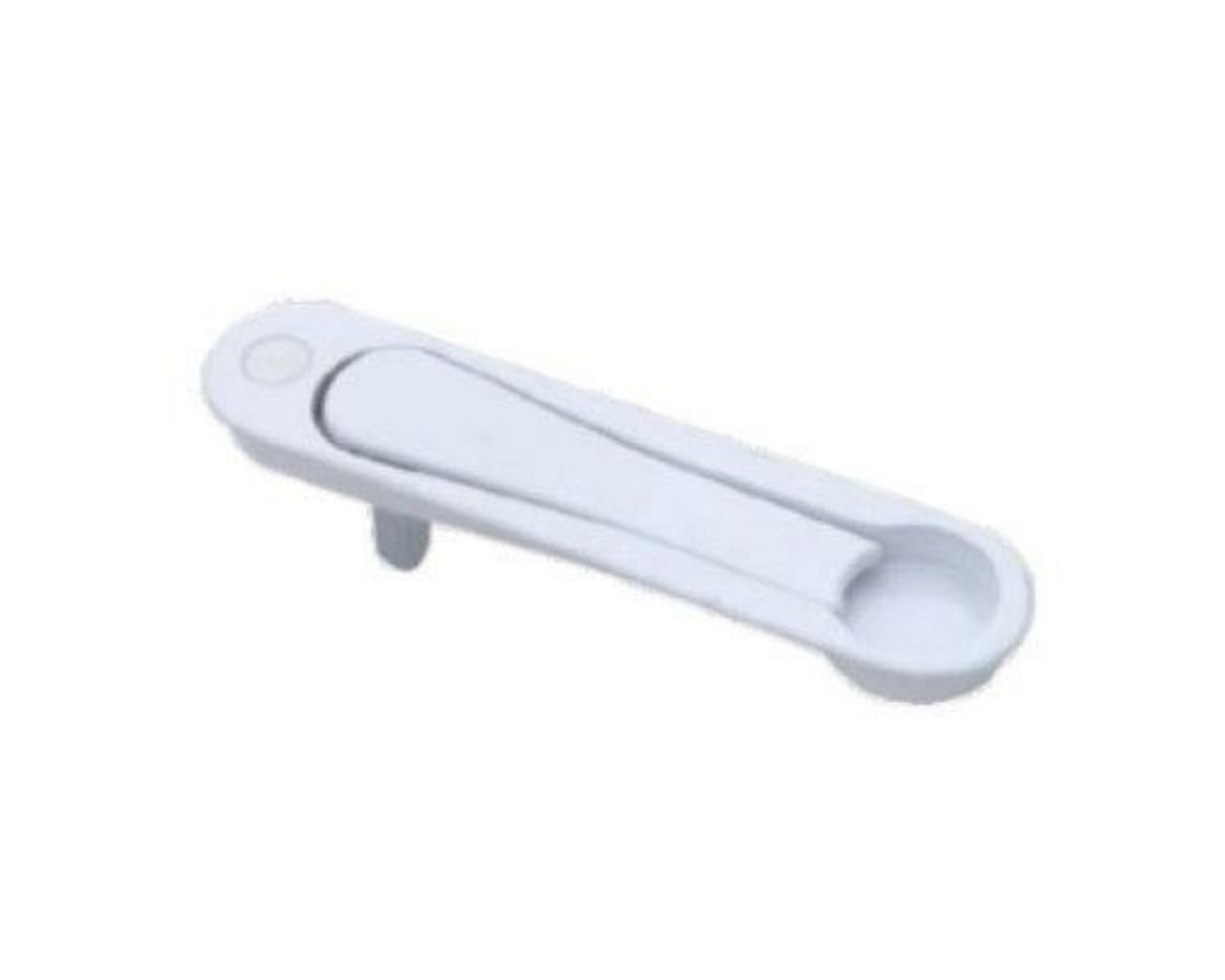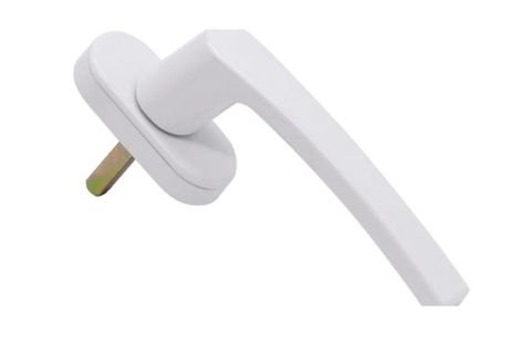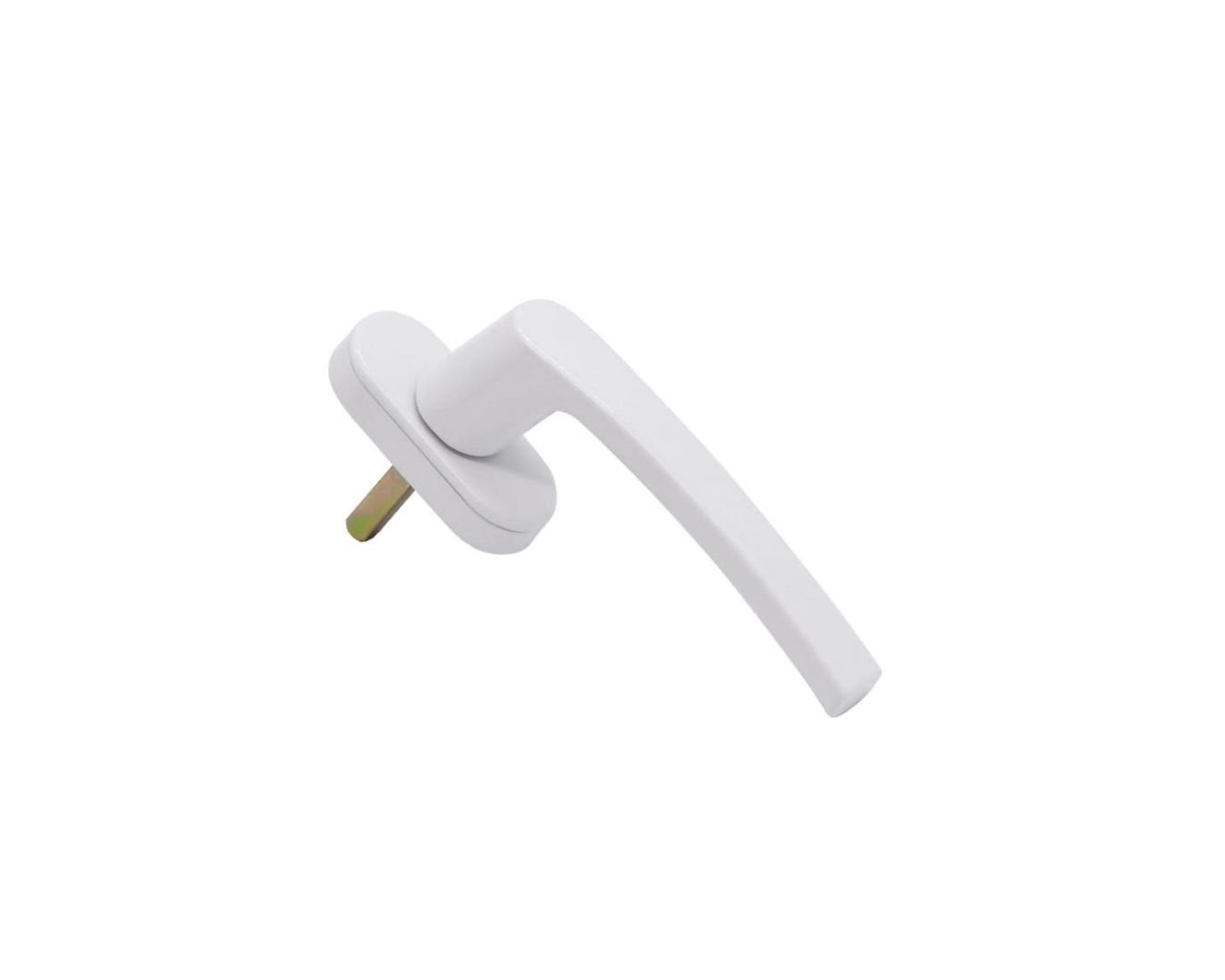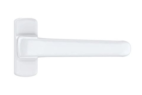Flat-lay shot of UPVC door handles, hinges, locks, and stoppers arranged aesthetically on white background, shadows soft, modern hardware display, 4K product photography style.