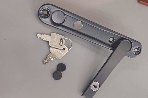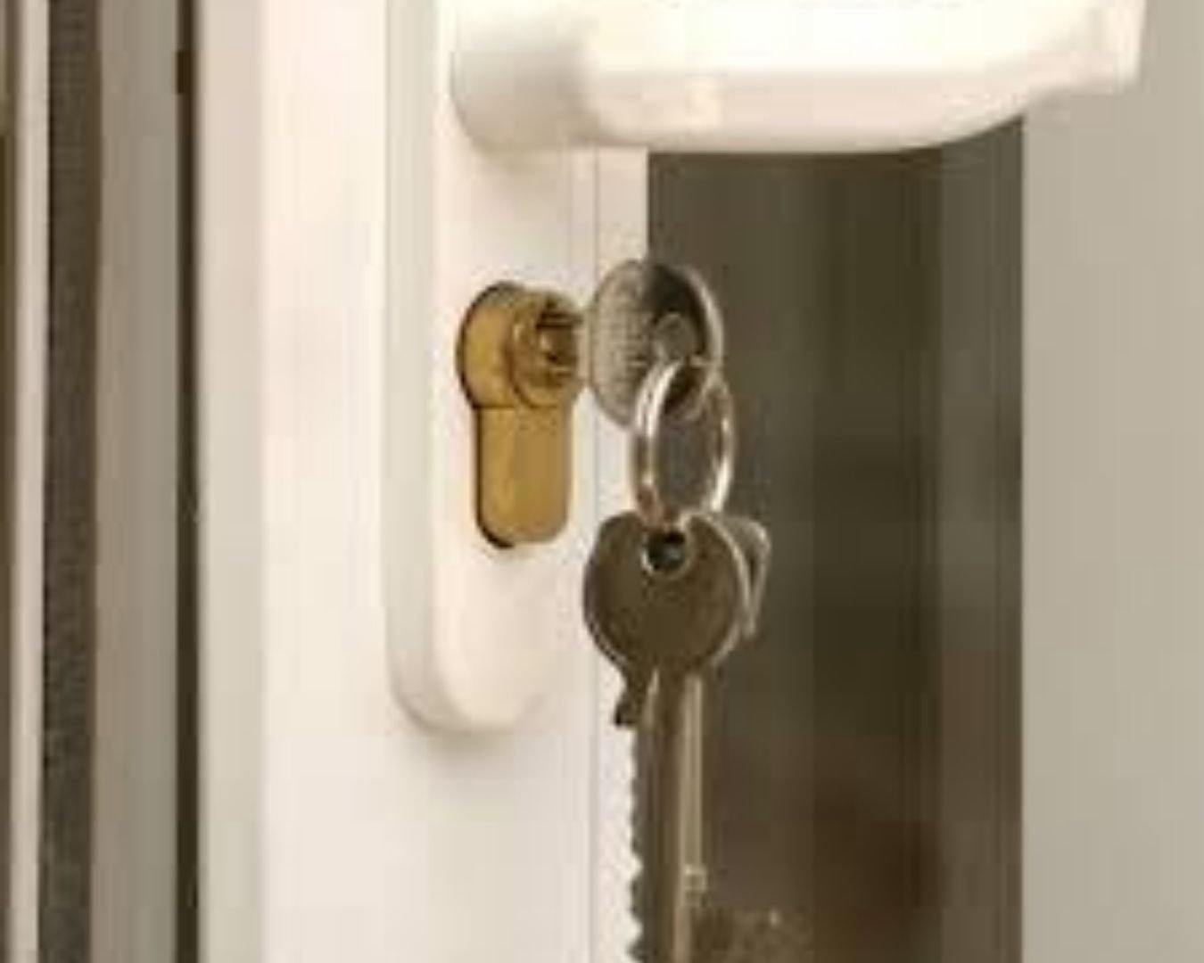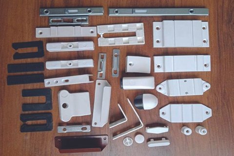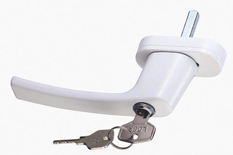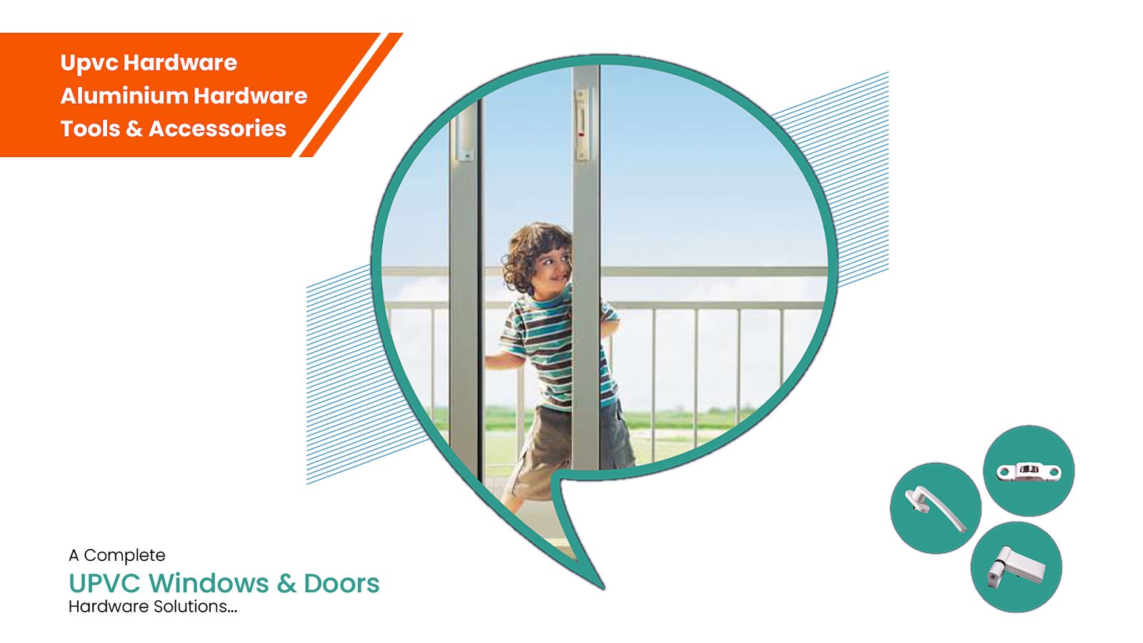 A clean, premium workshop setup with neatly arranged UPVC hardware items — door handles, multi-point locks, rollers, hinges, friction stays — placed on a smooth white surface with soft shadows. A technician installing a UPVC window in the background, sunlight entering from one side, warm and professional lighting, modern hardware showroom vibe, minimalistic composition, high-detail 4K product clarity, blue-white color tones, wide header layout.