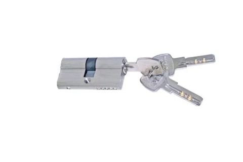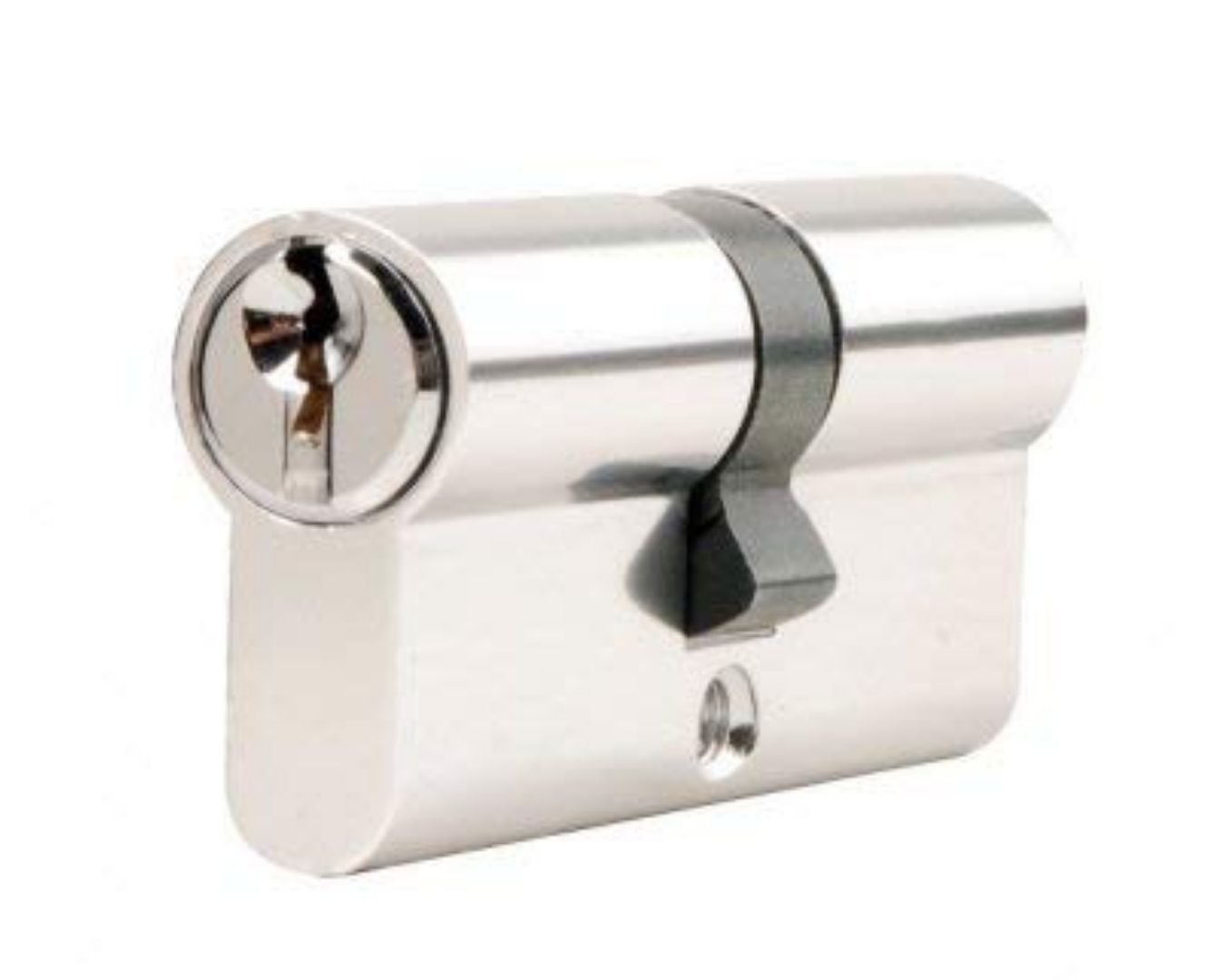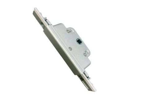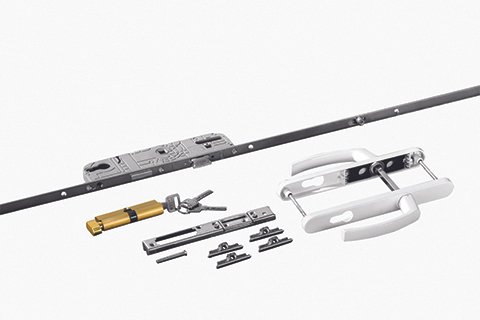 Close-up macro photograph of a multi-point locking strip laid diagonally, chrome finish, crisp metallic details, minimal backdrop, smooth lighting, premium UPVC hardware look.